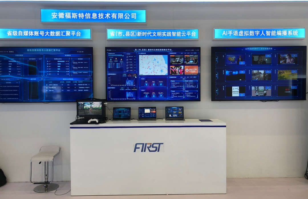 安徽福斯特信息技術有限公司此次應邀參展,以廣電媒體發(fā)展為亮點,集中展示大數(shù)據(jù)、人工智能呈現(xiàn)了AI-VLOG視頻智能合成系統(tǒng)+AI手語虛擬數(shù)字人智能編播系統(tǒng)+省級自媒體賬號大數(shù)據(jù)匯聚平臺+?。ㄊ?、縣區(qū))新時代文明實踐智能云平臺技術。